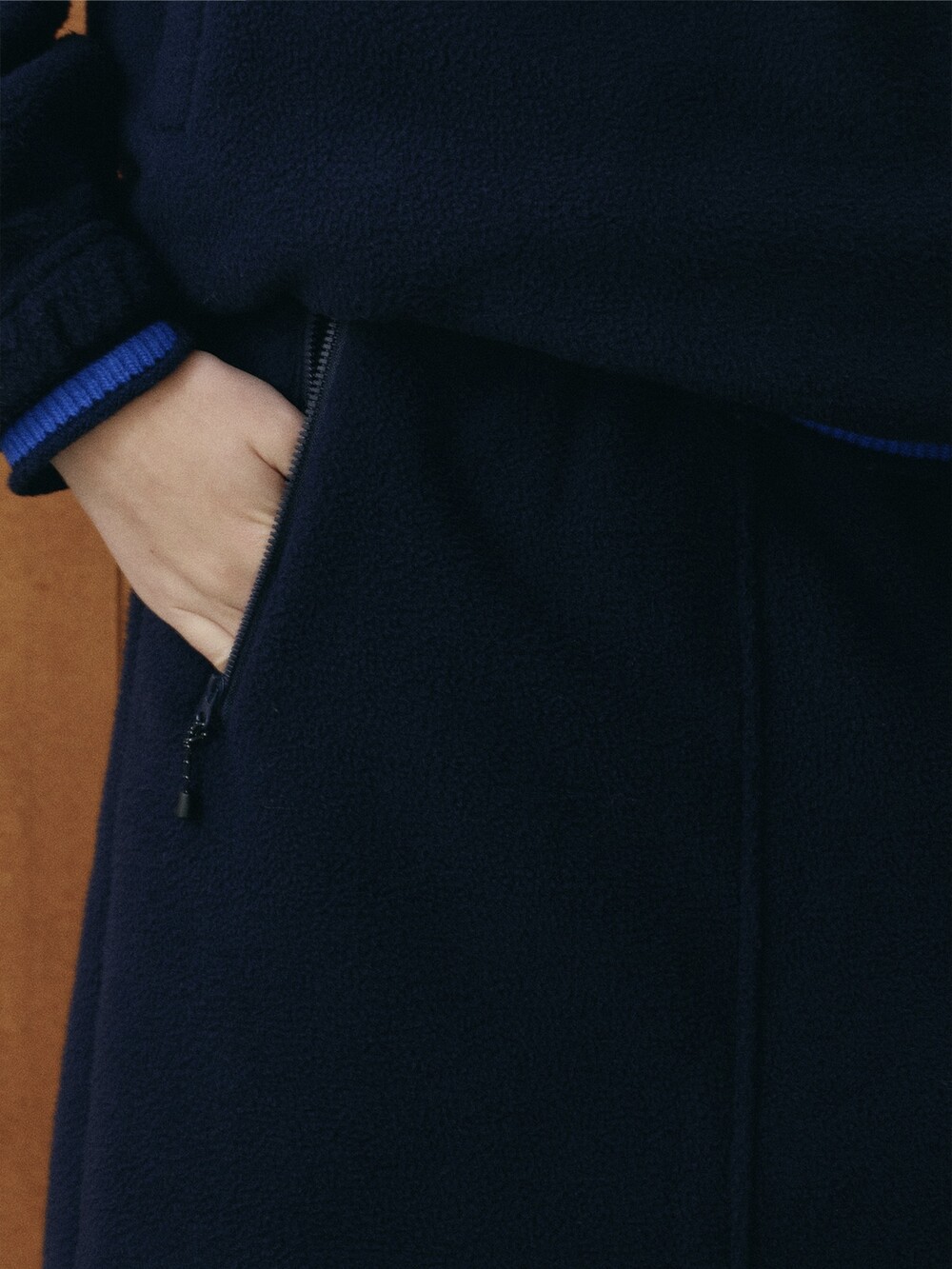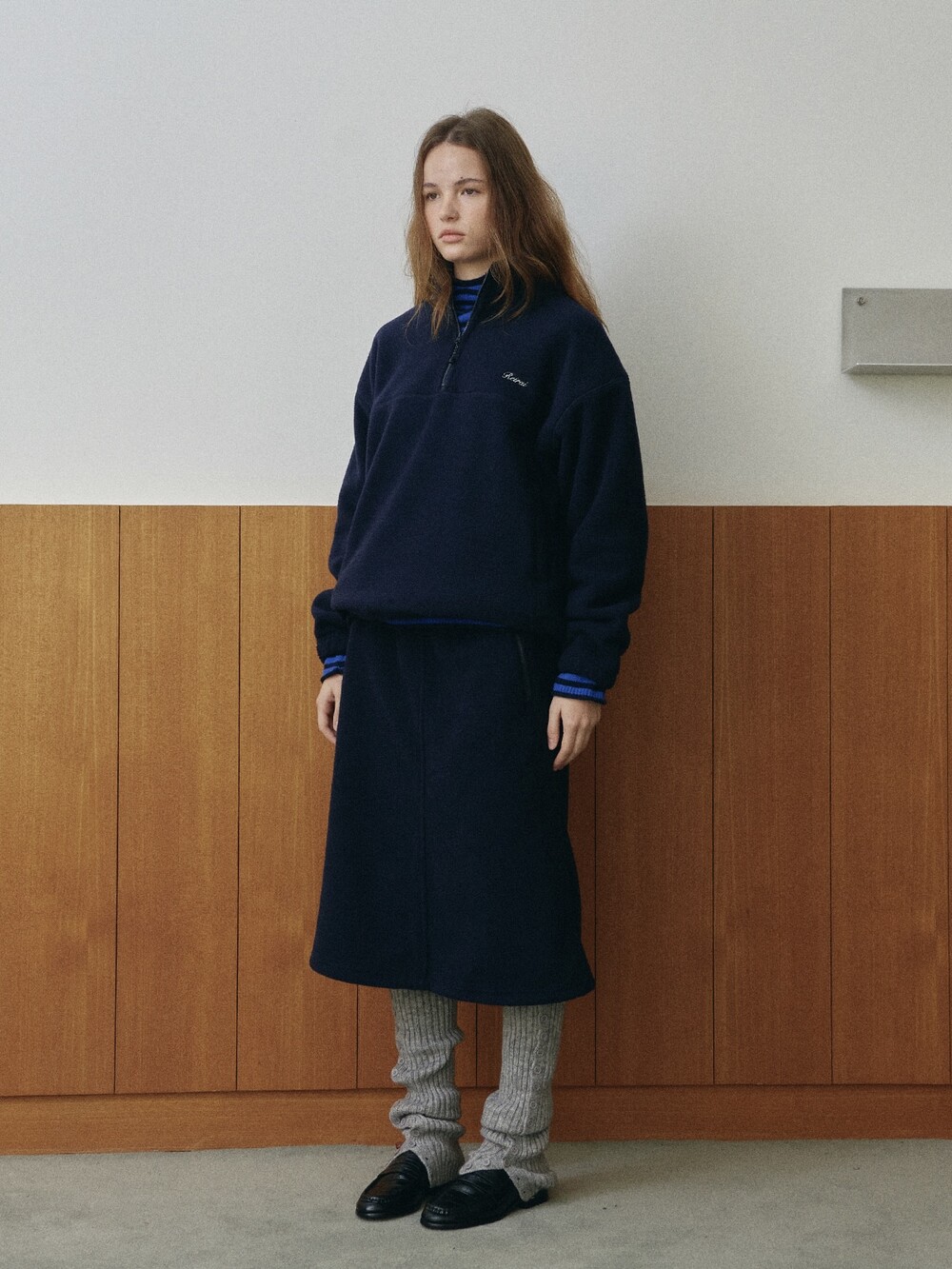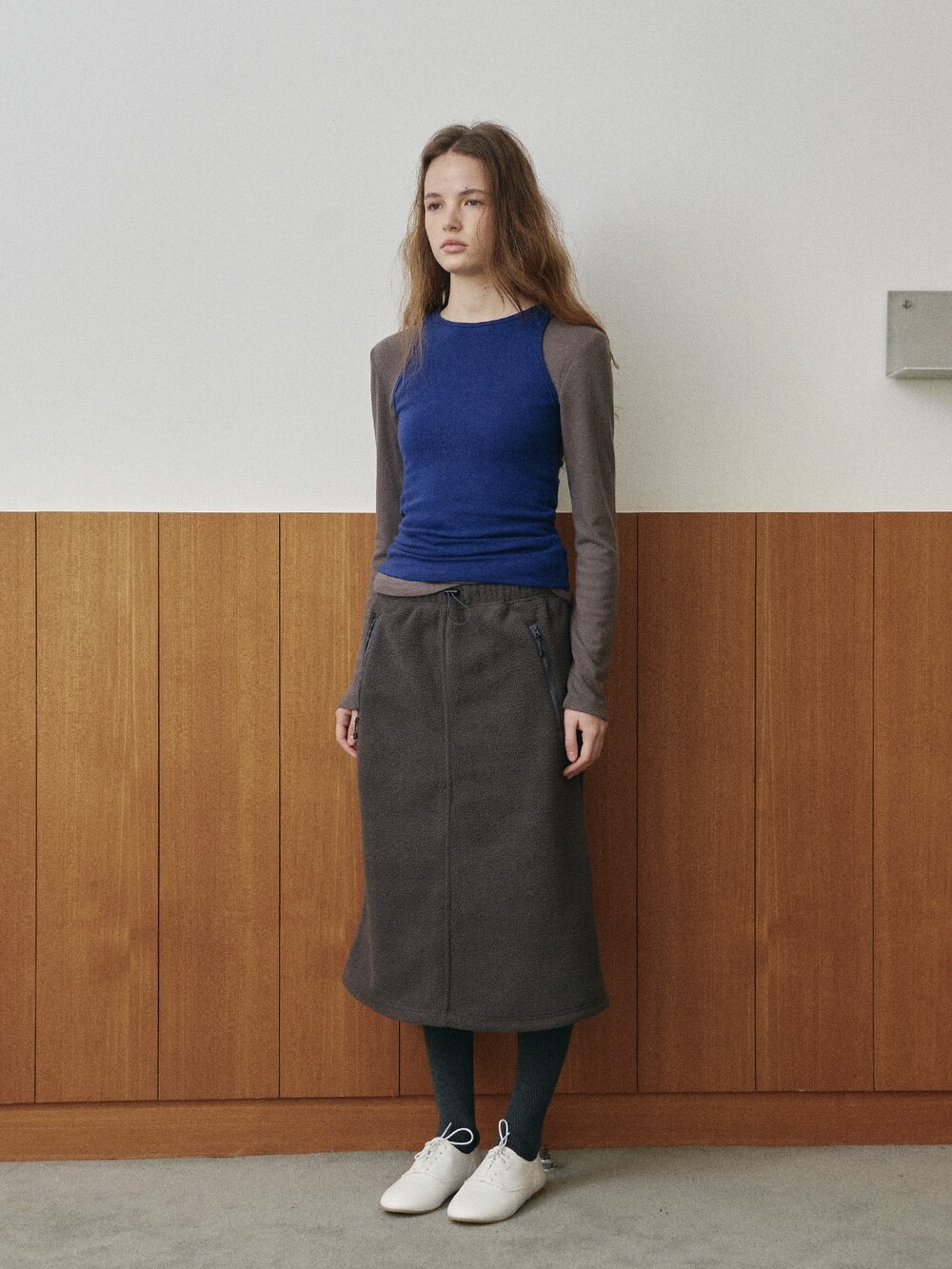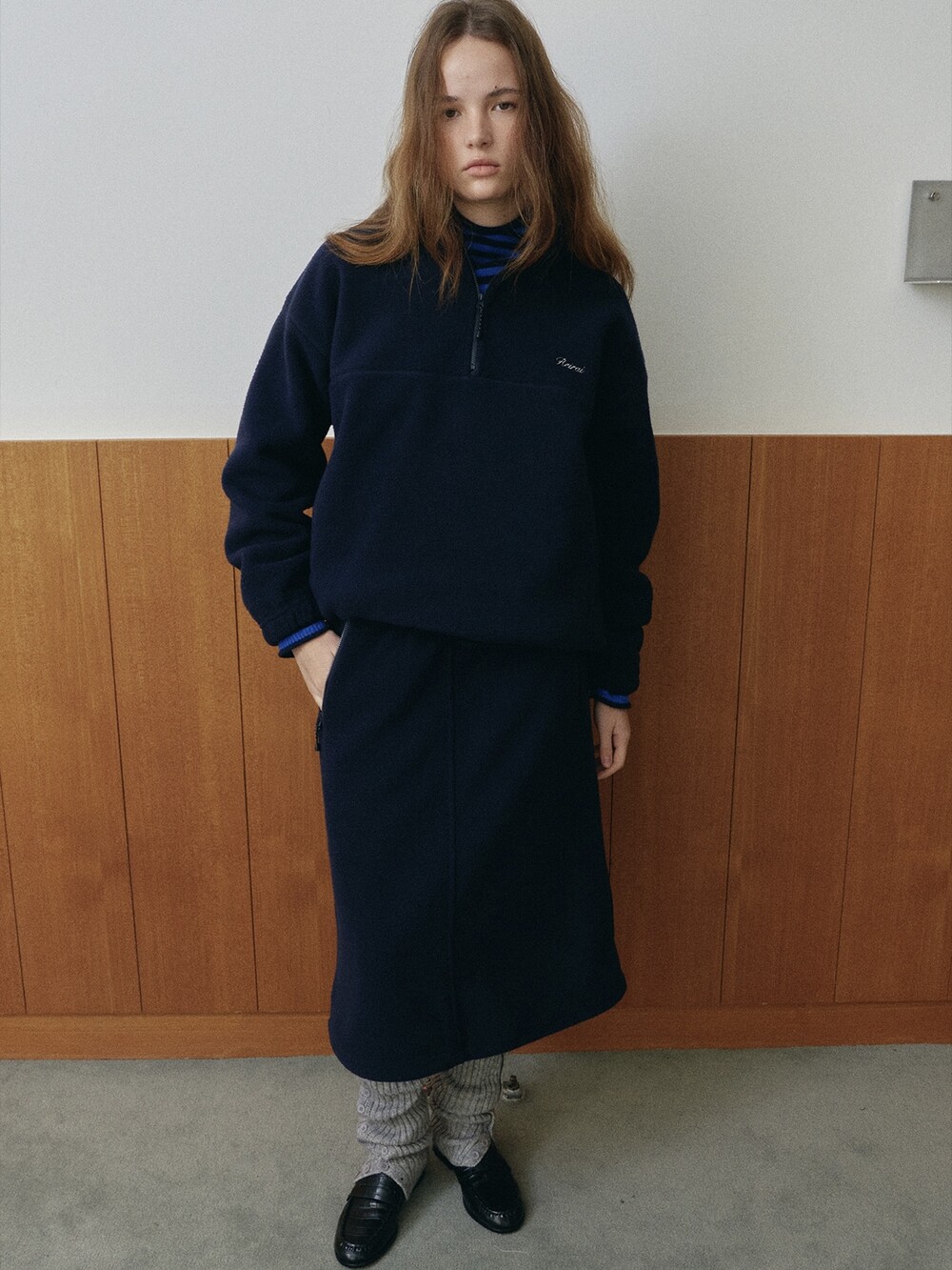Drawstring fleece midi skirt-NAVY/ CHARCOAL BROWN