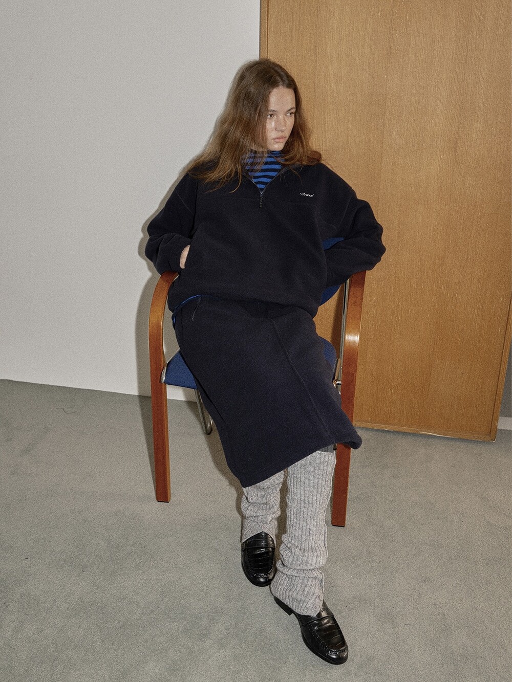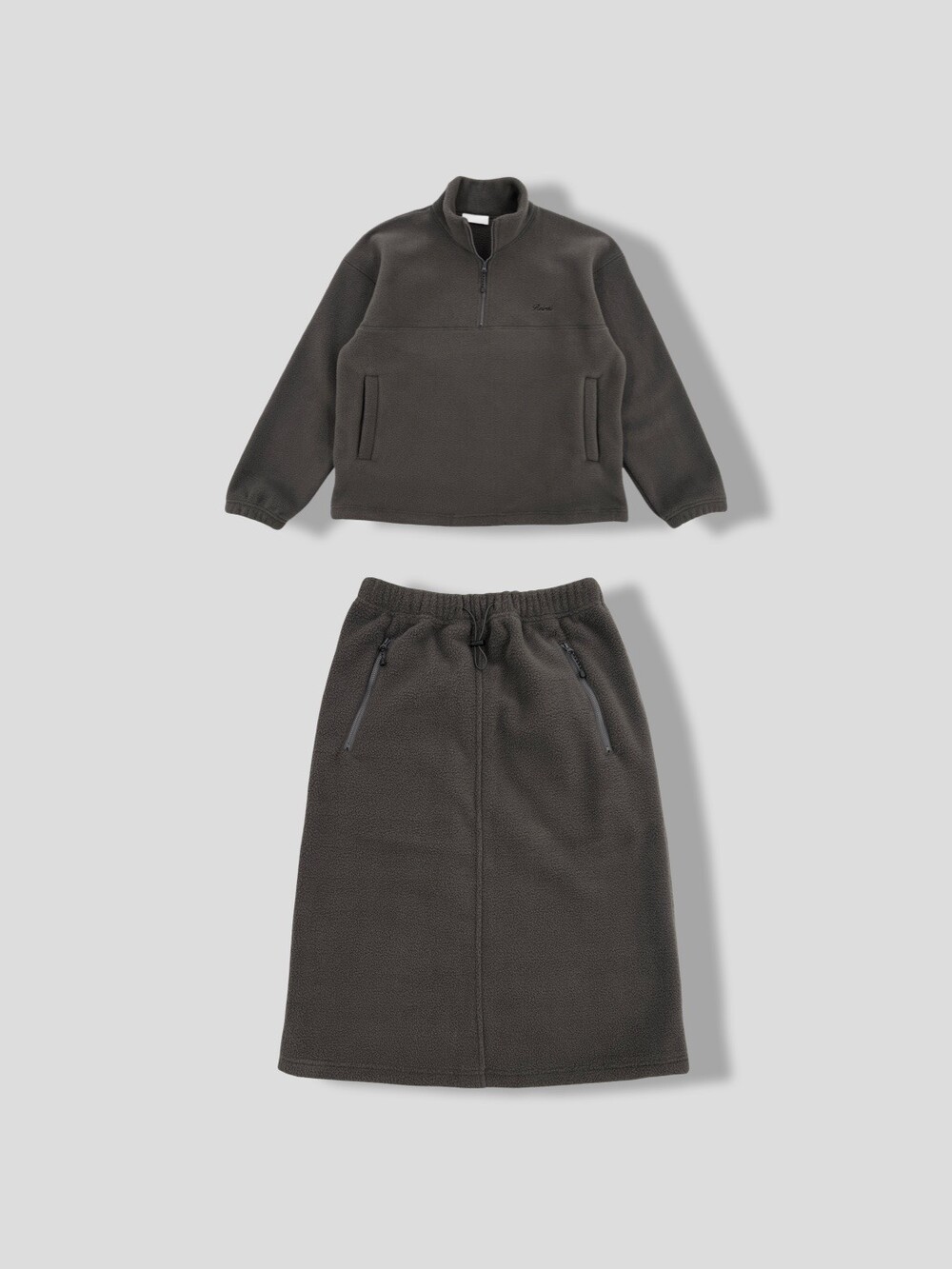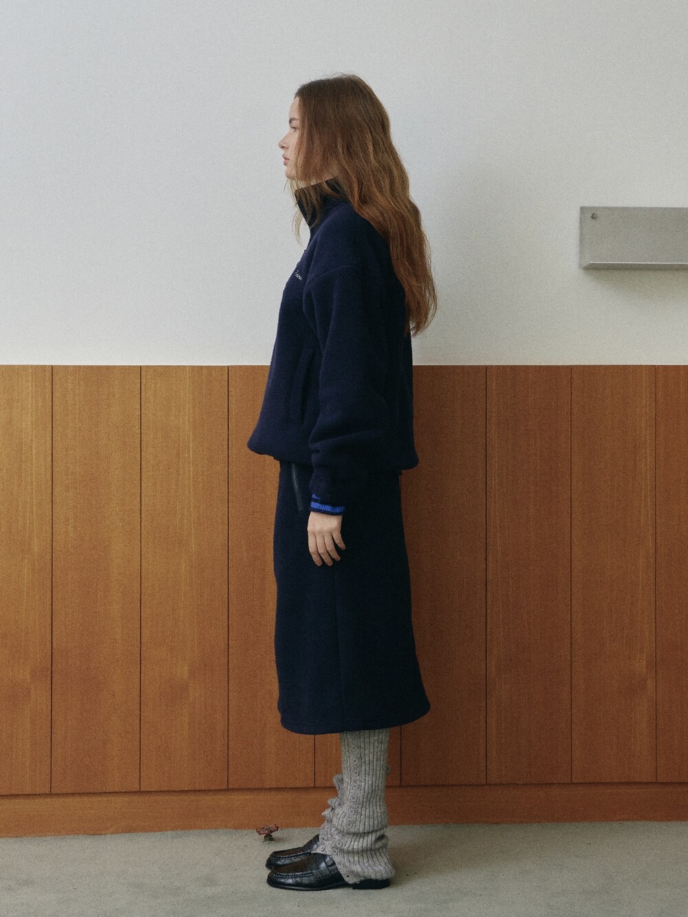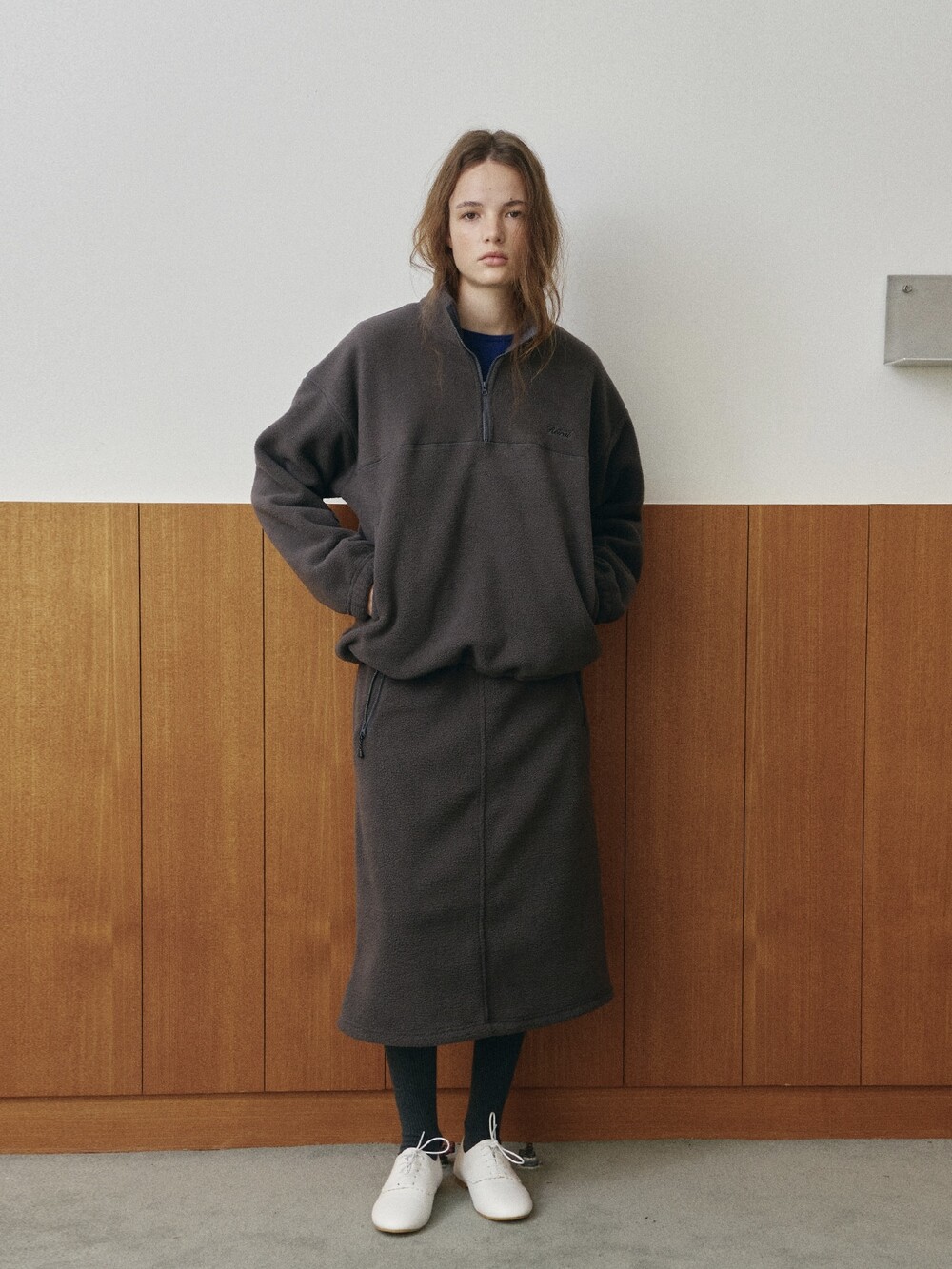 Drawstring fleece midi skirt-NAVY/ CHARCOAL BROWN