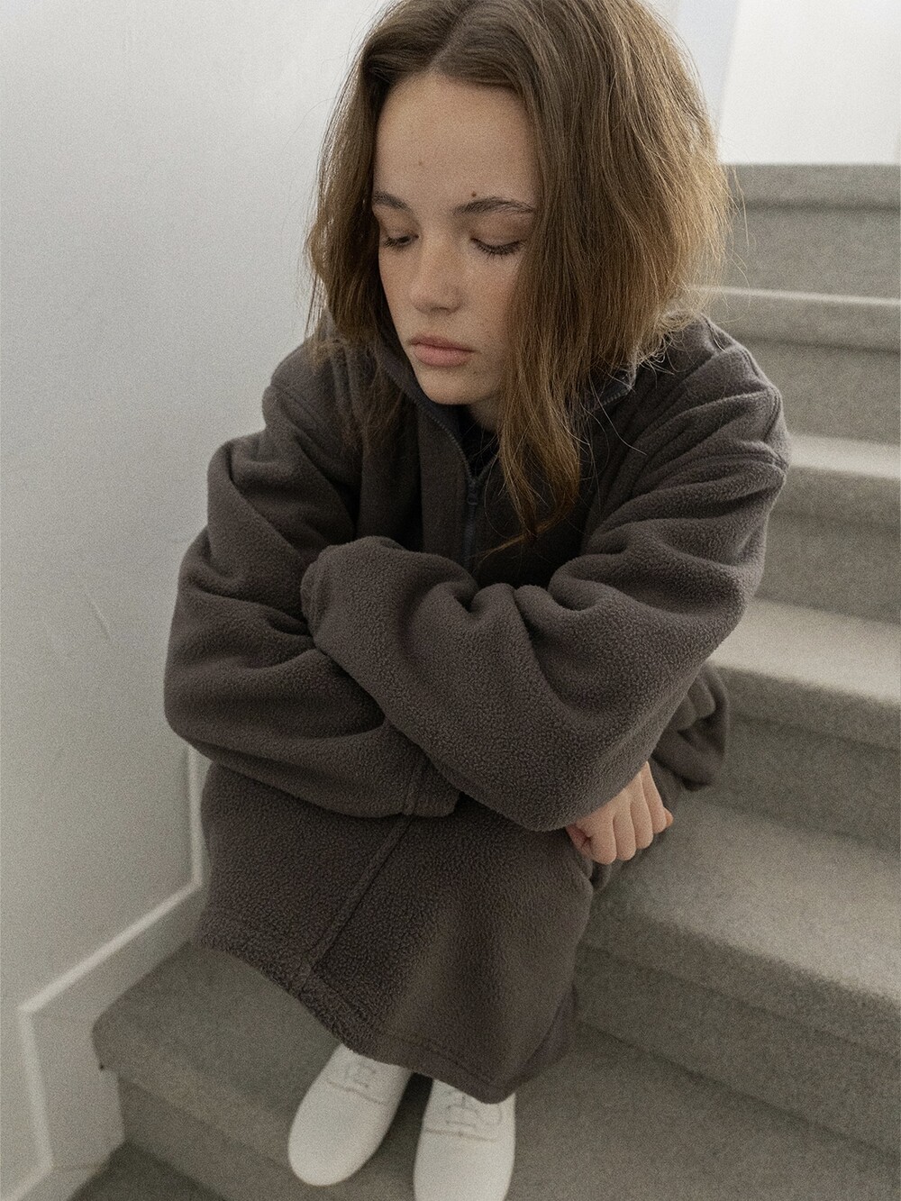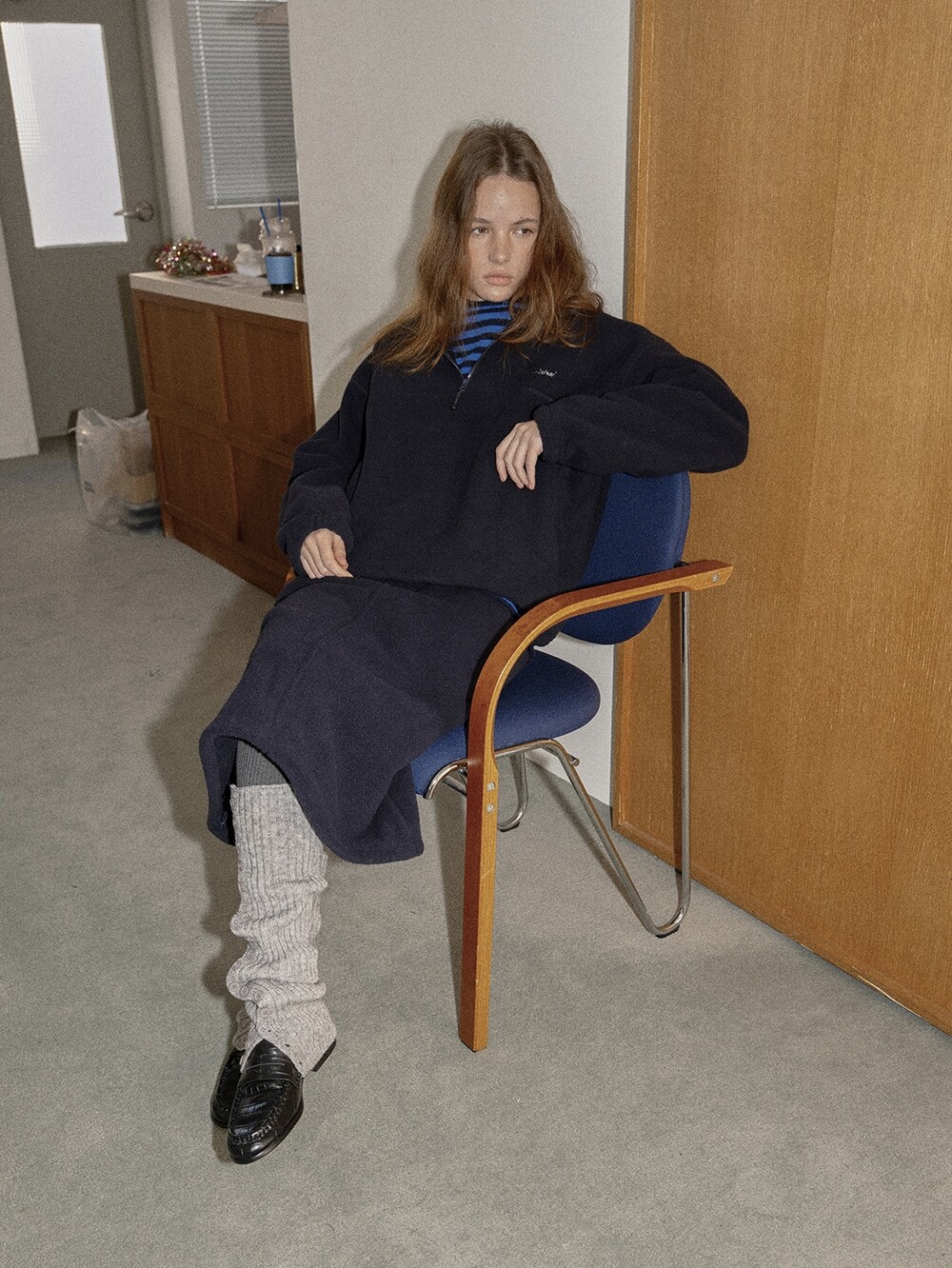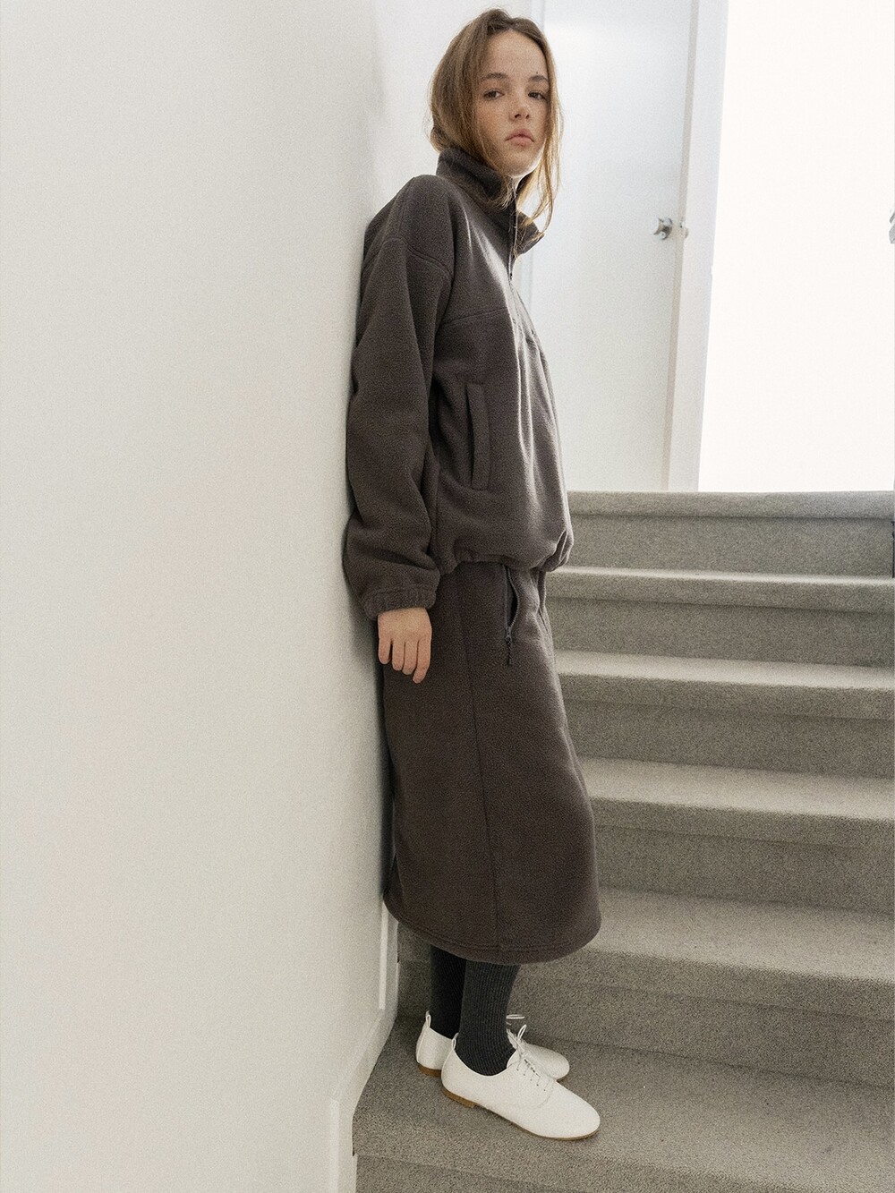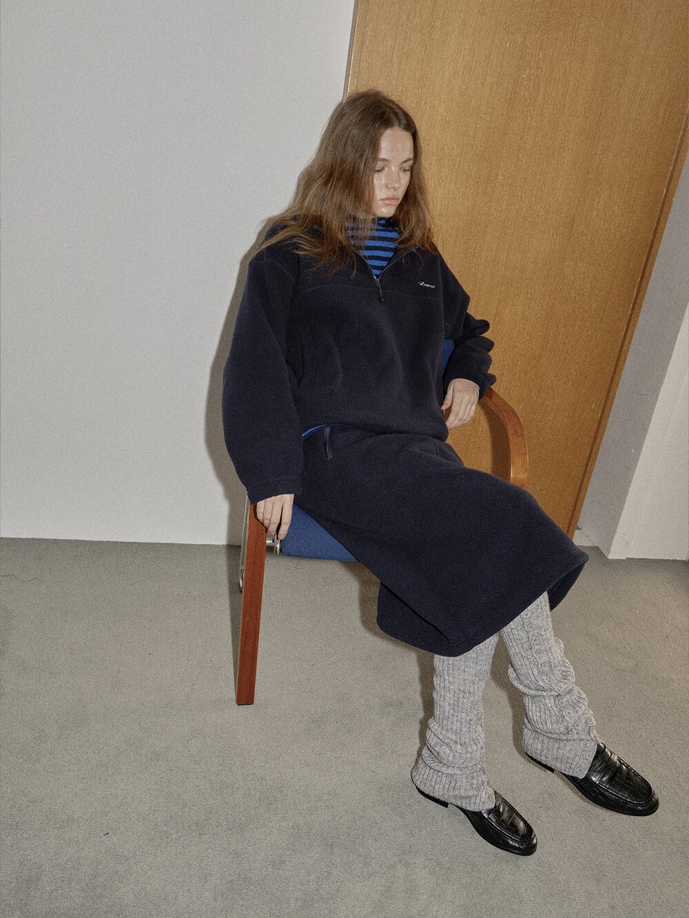 Drawstring fleece midi skirt-NAVY/ CHARCOAL BROWN
